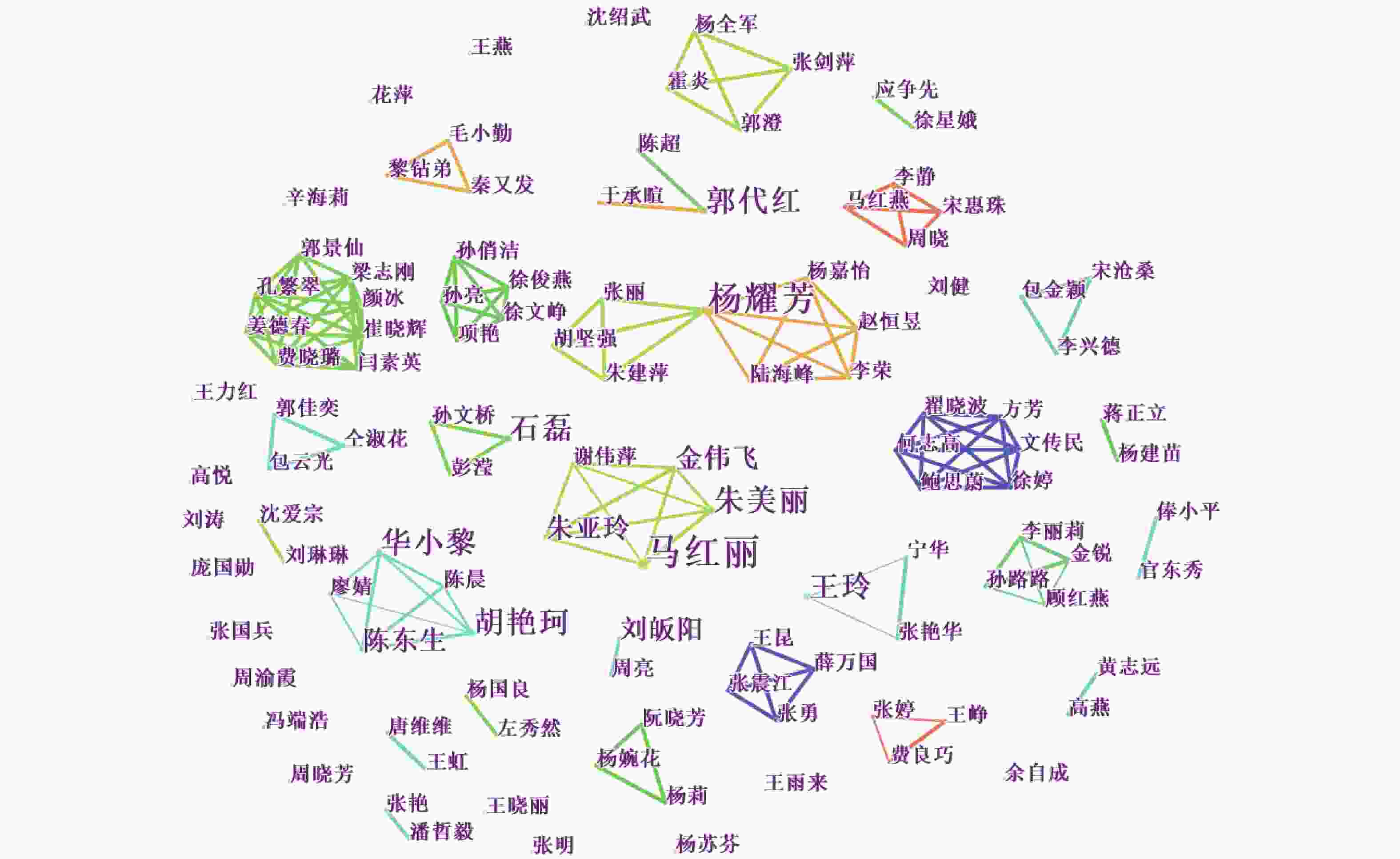 2012~2022年该领域发文量在3篇及以上的作者共有12位,其中马红丽发文最多(6篇),其次是杨耀芳(5篇)。排名前10的作者共计发文41篇,占总发文量的4.83%。图谱分析结果显示Nodes(节点)=116,Links(连线)=149,网络密度为0.022 3。团队之间存在合作的仅有杨耀芳团队与张丽团队,见图2。