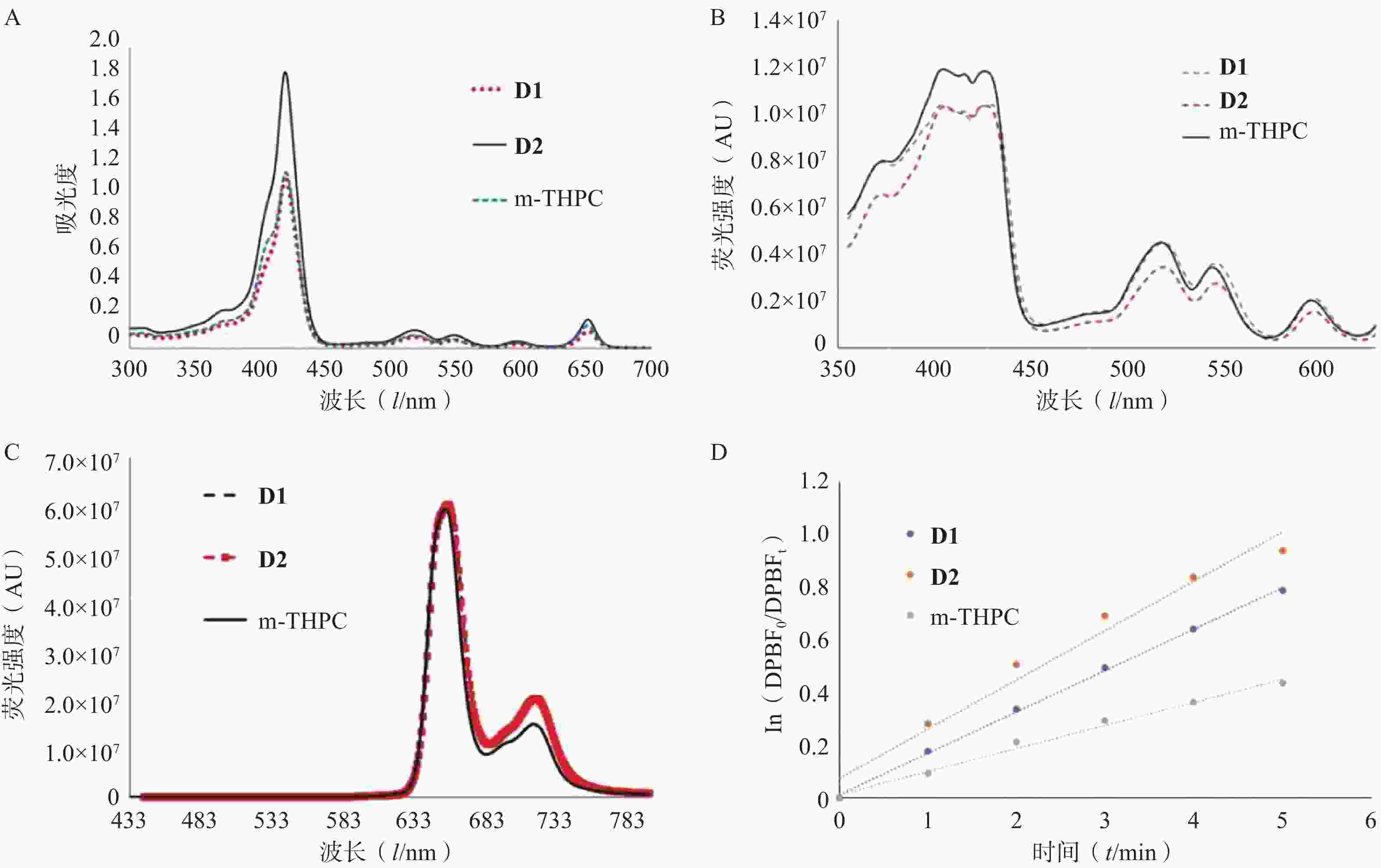 用DMSO将D1、D2和m-THPC的储备液稀释至5 μmol/L浓度的待测液,取3 ml待测液放置于石英比色皿中,利用紫外分光光度计检测化合物的紫外吸收光谱,并根据朗格比尔定律公式计算出对应的摩尔消光系数ε=吸光度/(比色皿厚度×待测液的浓度)。