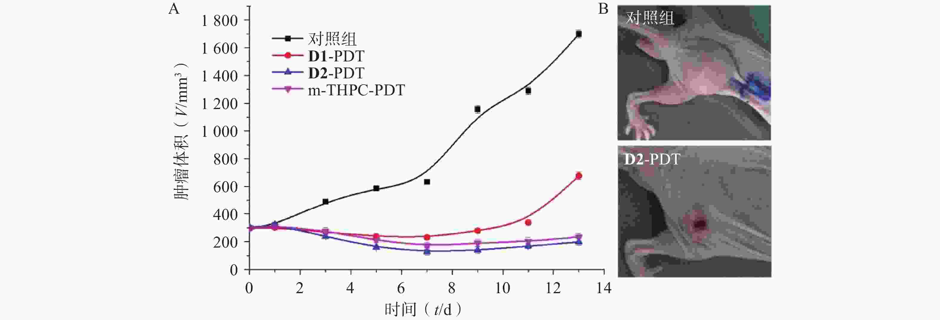 当荷瘤裸鼠的肿瘤直径大约为7 mm时,随机将其分为空白对照组和光动力组,每组5只。单纯药物组和光动力组荷瘤裸鼠经尾静脉缓慢注入0.2 ml含2.5 mg/kg光敏剂(D1、D2或m-THPC)的氯化钠溶液,30 min后异氟烷吸入麻醉单纯激光组和光动力组的裸鼠,使用激光器照射其肿瘤部位,照射光纤距肿瘤为2~3 cm,光斑面积约为1.5 cm;光斑覆盖肿瘤激光功率为200 mW/cm2,能量密度为100 J/cm2。分别在PDT后每隔1 d对小鼠进行拍照,监测小鼠的体重,测量肿瘤体积。