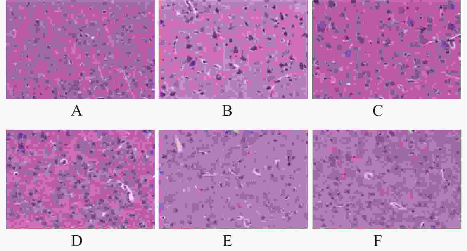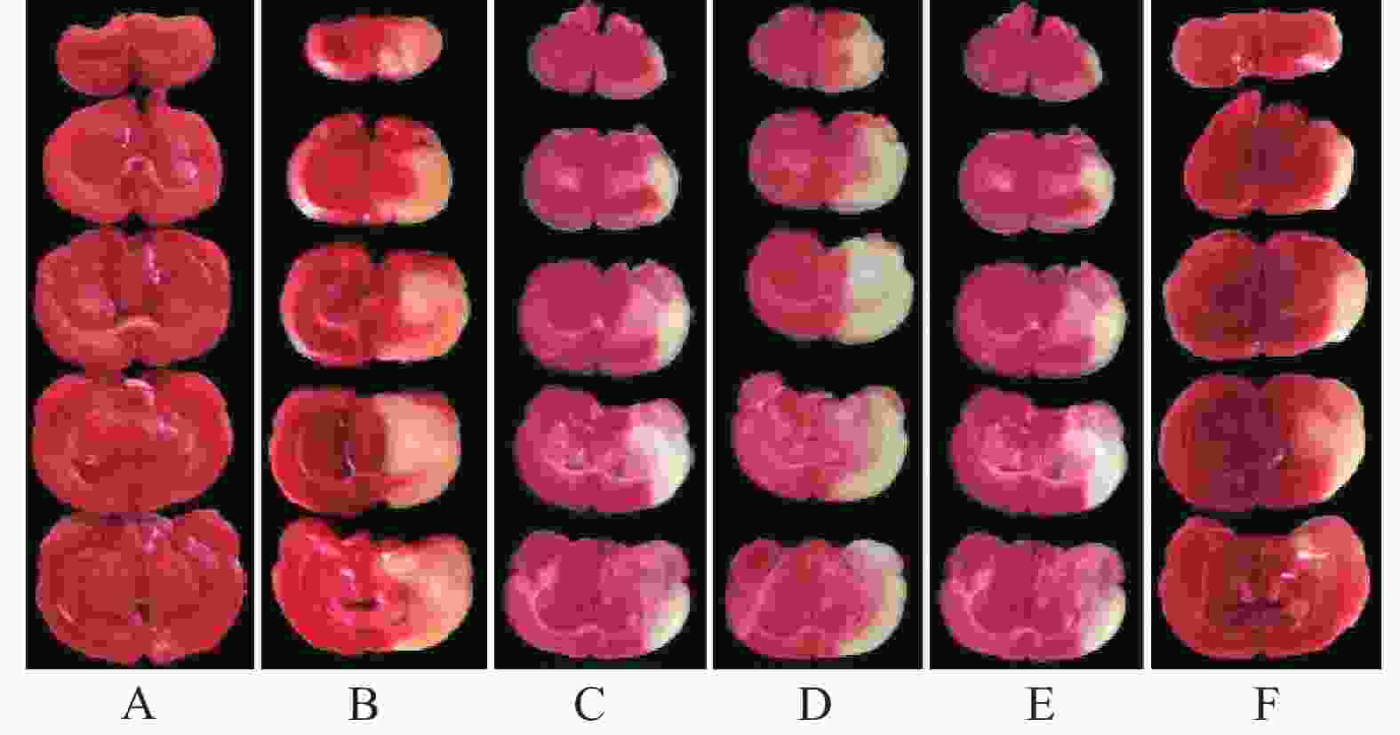 再灌注24 h后,分别随机取各组6只大鼠,参照文献报道的方法[13]进行神经功能缺失评分,无症状为0分、前肢不能伸展为1分、行走时转圈为2分、行走时跌倒为3分、不能行走或意识丧失为4分。ip戊巴比妥钠(40 mg/kg)进行麻醉后,颈椎脱臼处死,取大脑组织、−20 ℃冻存15 min后均匀厚度切为5片,2% TTC溶液恒温37 ℃避光染色30 min,每5 min翻转一次,正常组织呈红色、梗死组织呈苍白色,通过图像分析软件计算脑梗死率。
