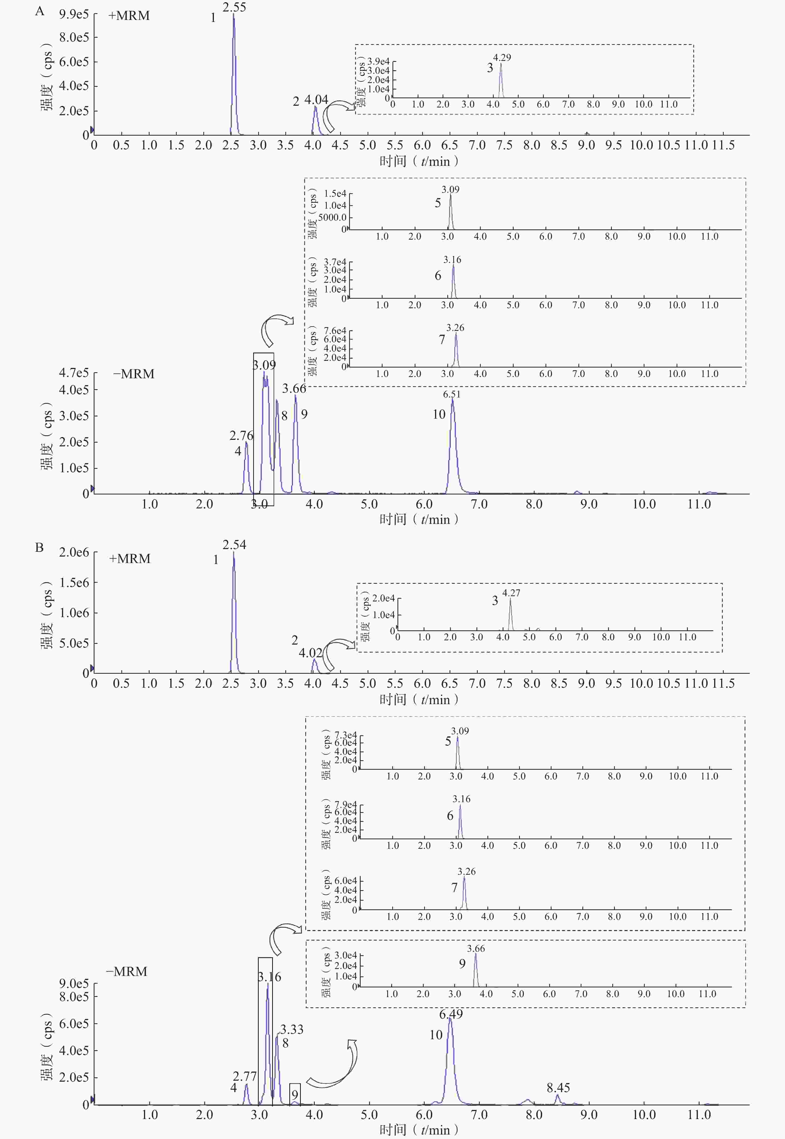 本实验分别考察了0.1%甲酸水-甲醇和0.1%甲酸水-乙腈作为流动相对10种成分分离效果的影响。选用0.1%甲酸水-甲醇为流动相时,10种成分的峰形和响应强度较好,故选用0.1%甲酸水-甲醇作为流动相。