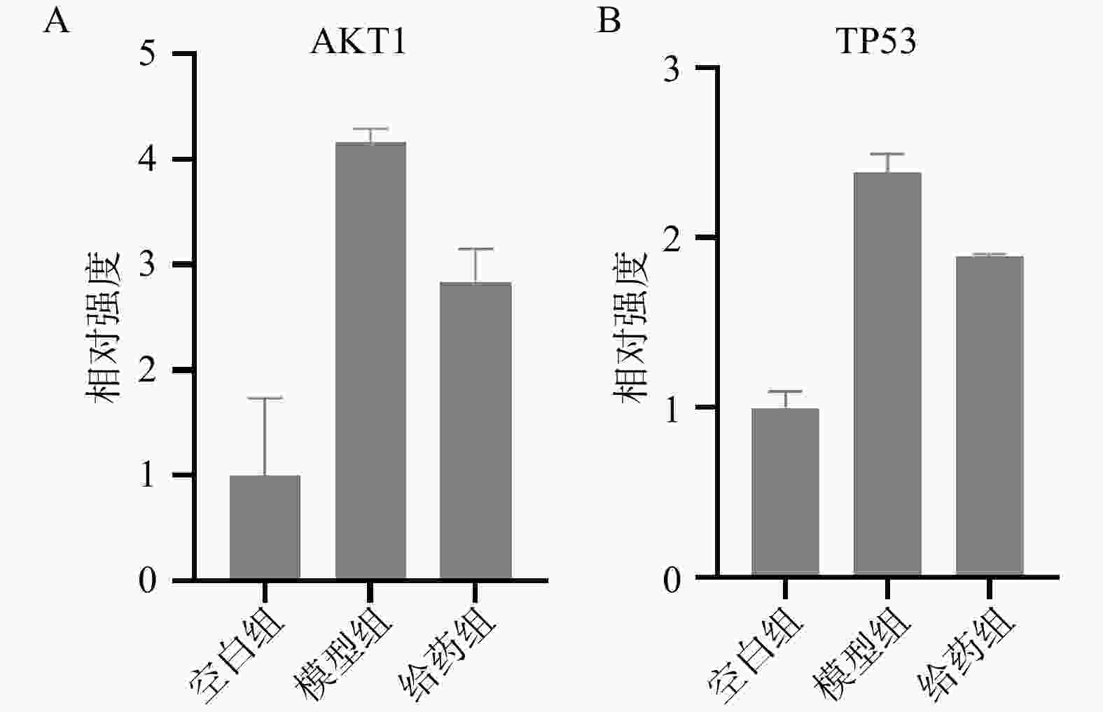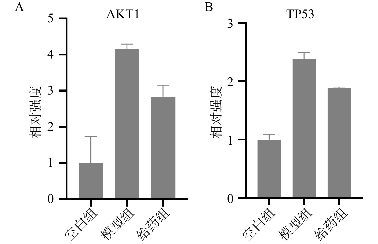 • 反应体系(20μl):cDNA模板2μl,2×SYBR Green Master Mix 10μl,正/反向引物(10μmol/L)各 0.5μl,无菌水 7μl;反应条件:95 ℃预变性10 min;40个循环(95 ℃ 15 s,60 ℃ 1 min);使用2–∆∆Ct计算并比较AKT1和TP53基因的相对表达量。