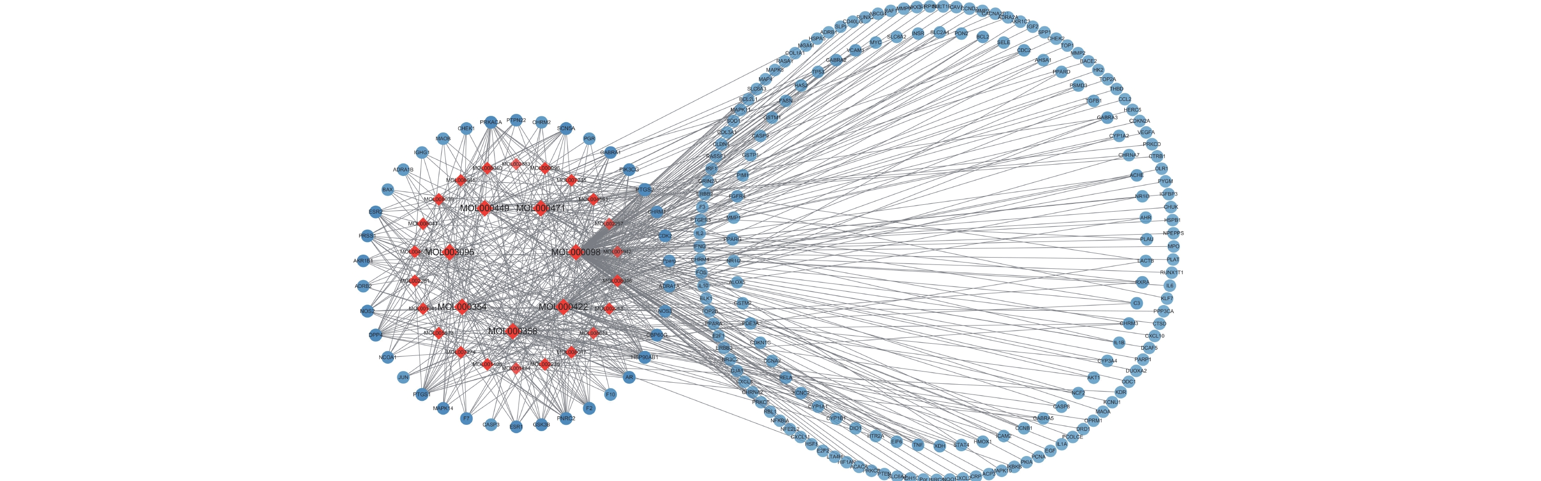 根据高通量对接得到的茵陈蒿汤活性化合物靶标信息,构建“成分-靶标”网络,直观地表现中药复方“多成分-多靶标”的作用特点,揭示复方配伍起效的机制。构建的网络图如图4所示,该图包含244个节点:红色代表茵陈蒿汤关键成分,蓝色代表茵陈蒿汤主要作用靶点。