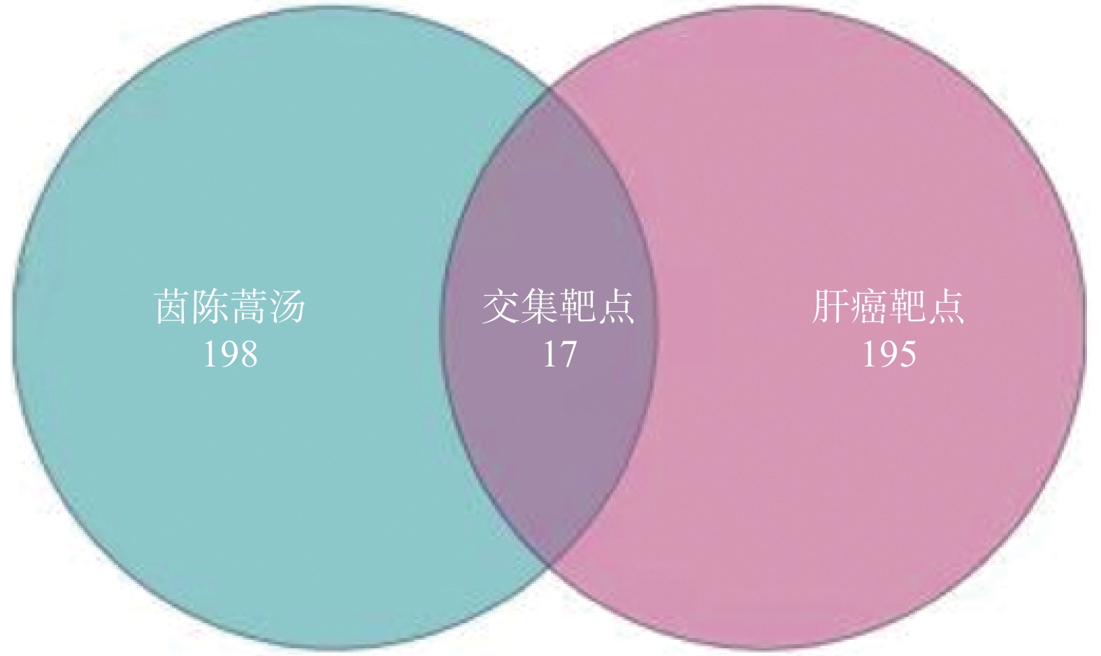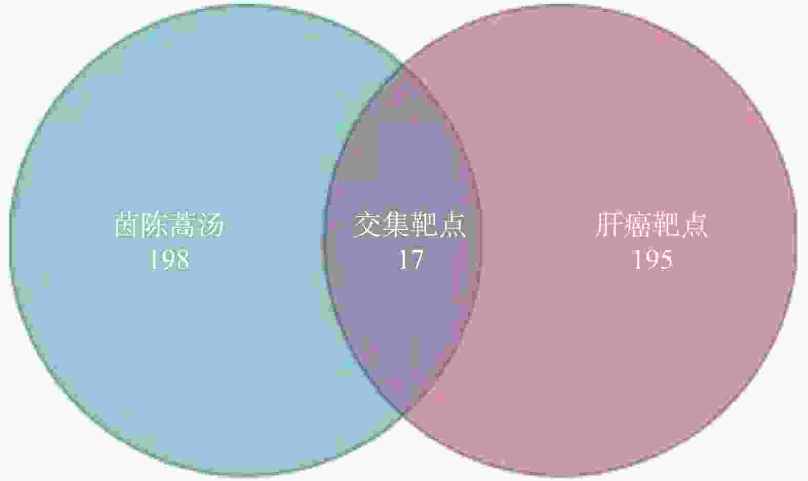 • 利用数据库Gene Cards数据库(https://www.genecards.org/[8]以“Hepatocellular carcinoma”进行检索,获取肝癌作用靶点。利用 Venny2.1.0在线工具,获得茵陈蒿汤和肝癌共同作用靶点,即是茵陈蒿汤治疗肝癌的作用靶点。