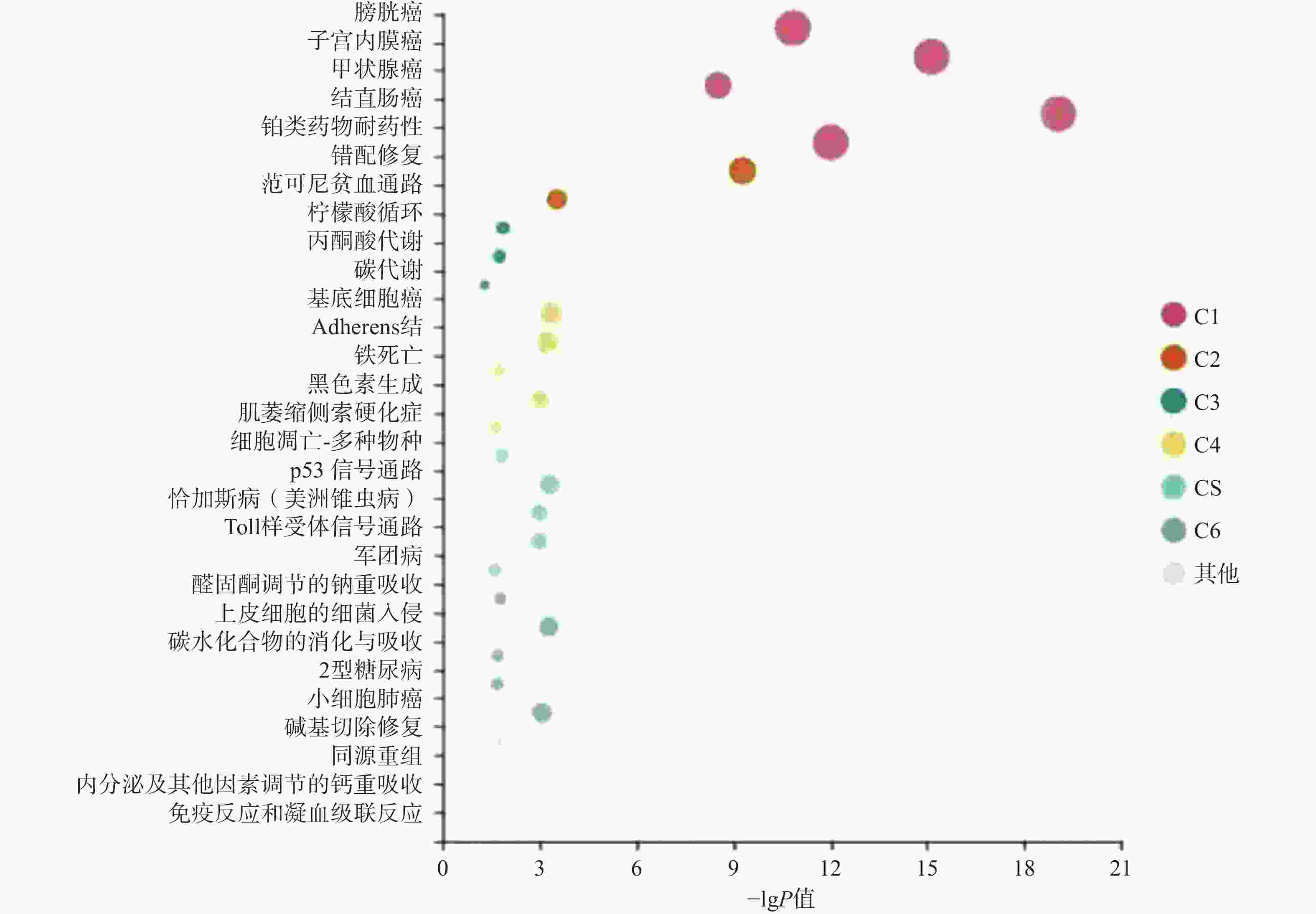 • 利用Metascape对共同作用靶点进行GO富集(图5),主要涉及DNA复制、染色体分离、白细胞介导的免疫和白细胞细胞间黏附等;KEEG富集结果(图6)主要涉及多种癌症通路、柠檬酸循环(TCA循环)、丙酮酸代谢、碳代谢铁突变、黑色素生成、肌萎缩性脊髓侧索硬化症(ALS)、P53信号通路、Toll 样受体信号通路、军团菌病、醛固酮调节的钠重吸收途径、细菌入侵上皮细胞、碳水化合物的消化和吸收、Ⅱ型糖尿病、小细胞肺癌、南美锥虫病、碱基切除修复、同源重组、内分泌和其他因子调节的钙重吸收以及补体和凝血级联等多条通路。