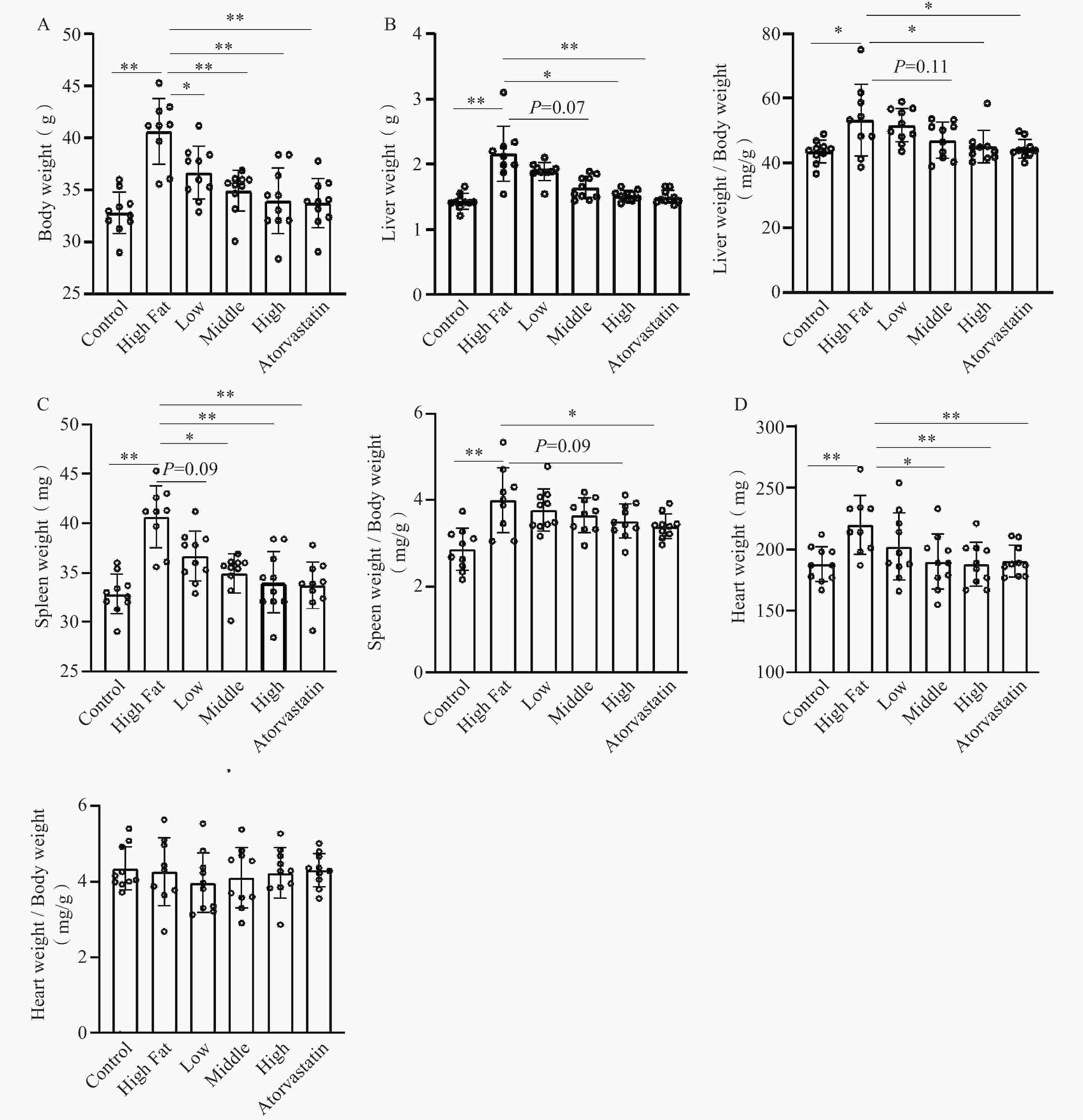 第5周,给药组开始灌胃给药,药物羧甲基纤维素钠混悬液(纯净水配成0.5%浓度)溶解,给药体积20 ml/kg。模型组和正常对照组给予同体积溶媒。给药8周后,动物禁食一天(正常饮水),眼眶取血,取血清,测定血脂指标,随后动物使用0.9%氯化钠溶液灌注后,取肝脏、心脏和脾脏,测定重量,计算脏器指数,肝中叶冻存用于分子生物学检测,肝右叶使用4%多聚甲醛固定,用于油红染色等病理检测。