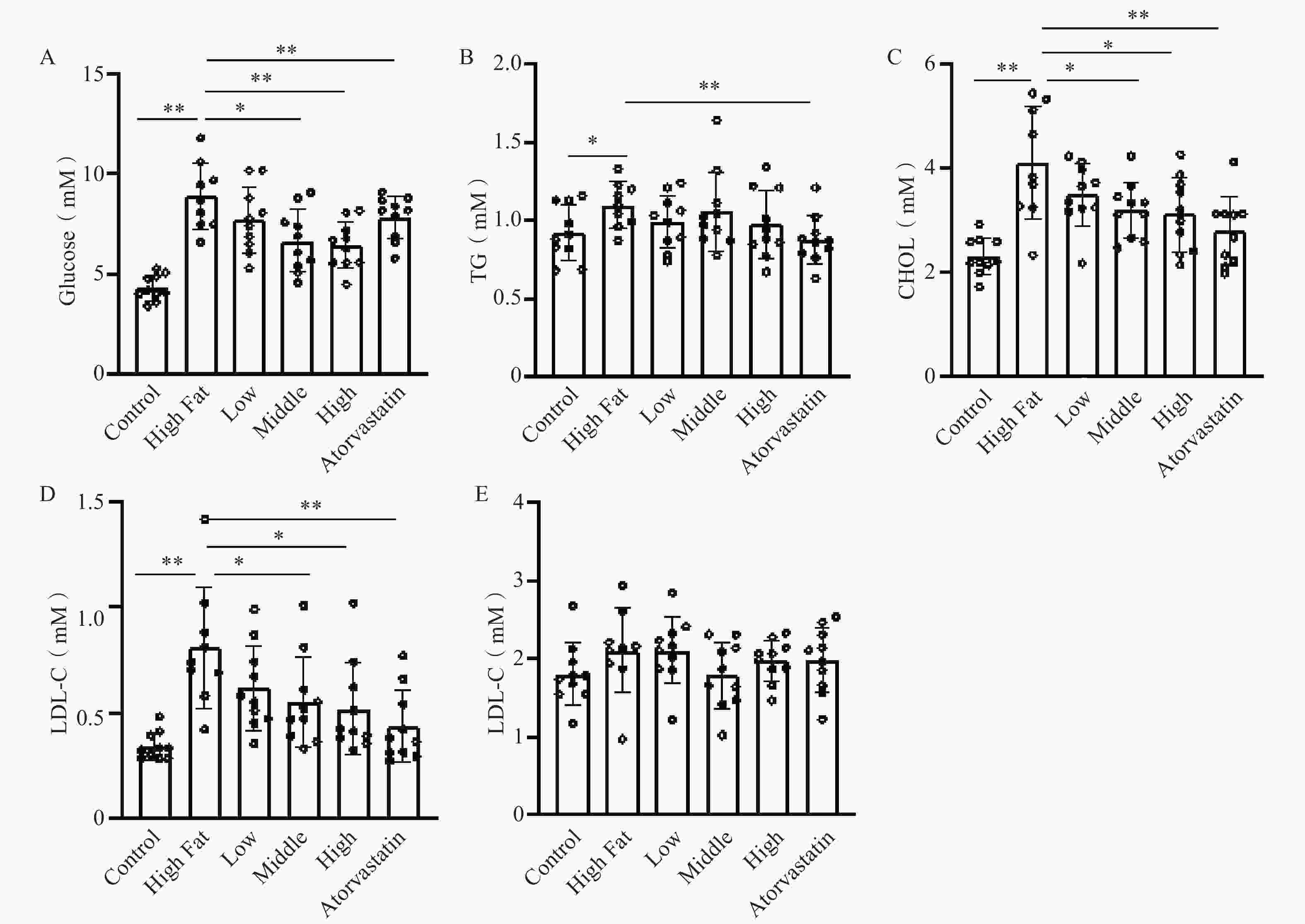 血脂:与正常对照组相比,高脂模型动物组TG显著增加(1.10±0.15比0.92±0.18 mM,P<0.05),并显著地增加CHOL水平(4.10±0.1.09 mM比 2.31±0.36 mM,P<0.01);阳性药物组显著地降低动物TG水平(0.88±0.16 mM 比1.10±0.15 mM,P<0.05),并同样显著降低CHOL水平(2.79±0.66 mM P<0.01)。与模型组相比,低、中、高剂量组TG水平均无显著差异,但低、中、高剂量组剂量依赖性地降低模型小鼠CHOL水平,中、高剂量组有统计学差异(中剂量组3.20±0.54 mM和高剂量组3.12±0.72 mM比模型组4.10±0.1.09 mM,P<0.05)。LDL-C结果类似,中、高剂量组和阳性药物LDL-C水平显著降低(中剂量组0.55±0.21 mM;高剂量组0.52±0.22 mM,P<0.05;阳性药物组0.43±0.17 mM比模型组0.81±0.29 mM,P<0.01)。与正常对照组比较,高脂造模组与各给药组HDL-C水平无显著差异,具体结果见图2B~2E。