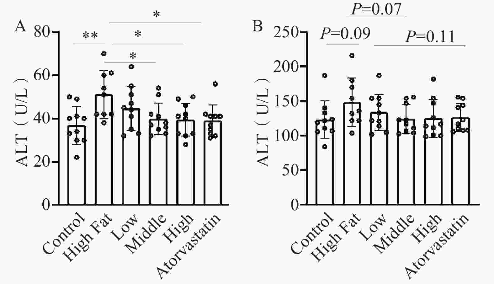 肝功能指标。ALT:与正常对照组比较,高脂模型组动物ALT显著增加(51.1±11.0 U/L比36.9±8.79U/L,P<0.01)。与模型组比较,低、中、高剂量组ALT剂量依赖性地降低,中、高剂量组差异显著(中剂量组39.9±7.37U/L;高剂量组39.4±7.63U/L,P<0.05)。阳性药物组ALT水平显著降低(38.9±7.29 U/L,P<0.05)(图3A)。AST:高脂模型组AST水平增加,但无统计学差异(148±35.1比123±27.3 U/L,P>0.05)。与模型组比较,低、中、高剂量组AST水平降低,但无统计学差异(P>0.05);阳性药物组AST水平降低,与模型组比较无统计学差异(图3B)。