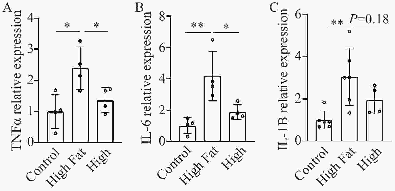 为探讨血通胶囊降低血脂、减轻肝脏损伤的机制,我们选择TNF-α、IL-6和IL-1β三个炎性因子,利用PCR技术,检测其变化情况,治疗组选择疗效最为显著的高剂量组。与正常对照组比较,高脂模型组动物TNF-α、IL-6和IL-1β表达均显著增加(TNF-α:2.40±0.68 比1.00±0.56,P<0.05;IL-6:4.17±1.58 比1.00±0.51,P<0.01;IL-1β:3.04±1.36比1.00±0.43,P<0.01)。与模型组比较,高剂量组TNF-α和IL-6表达显著降低(TNF-α:1.37±0.38比2.40±0.68,P<0.05;IL-6:1.87±0.49 比4.17±1.58,P<0.05)(图5A-C)。高剂量组IL-1β水平降低,但统计学无显著性差异(1.95±0.66比3.04±1.36,P=0.18)(图5C)。以上结果说明,血通胶囊可以显著地降低肝脏组织炎性因子表达。