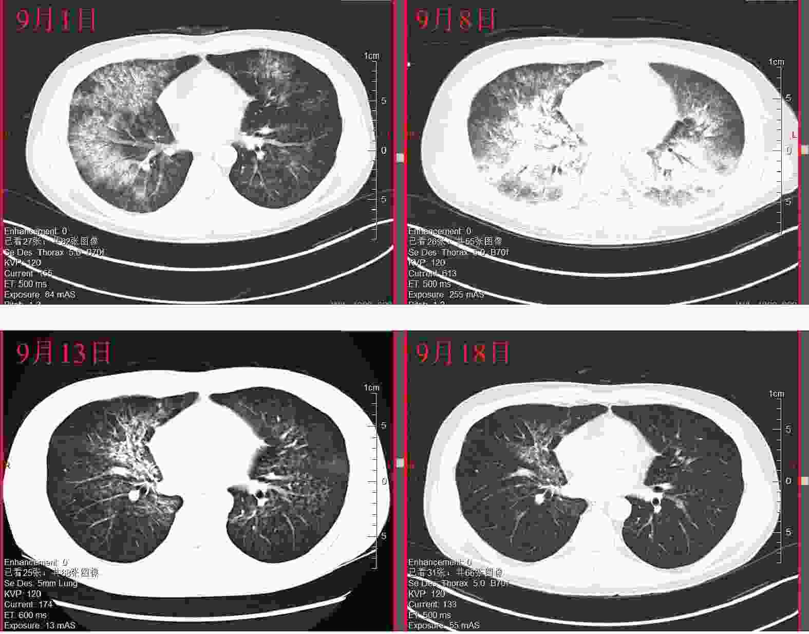 高剂量甲泼尼龙应用2 d后,及时降低甲泼尼龙剂量至120 mg,患者症状改善后,将激素减量至甲泼尼龙80 mg q12 h,并根据患者床旁胸片和肺部CT检查结果,逐步降低激素剂量,9月18日停用静脉激素,改为泼尼松片25 mg qd序贯口服治疗,降低激素所致的不良反应。