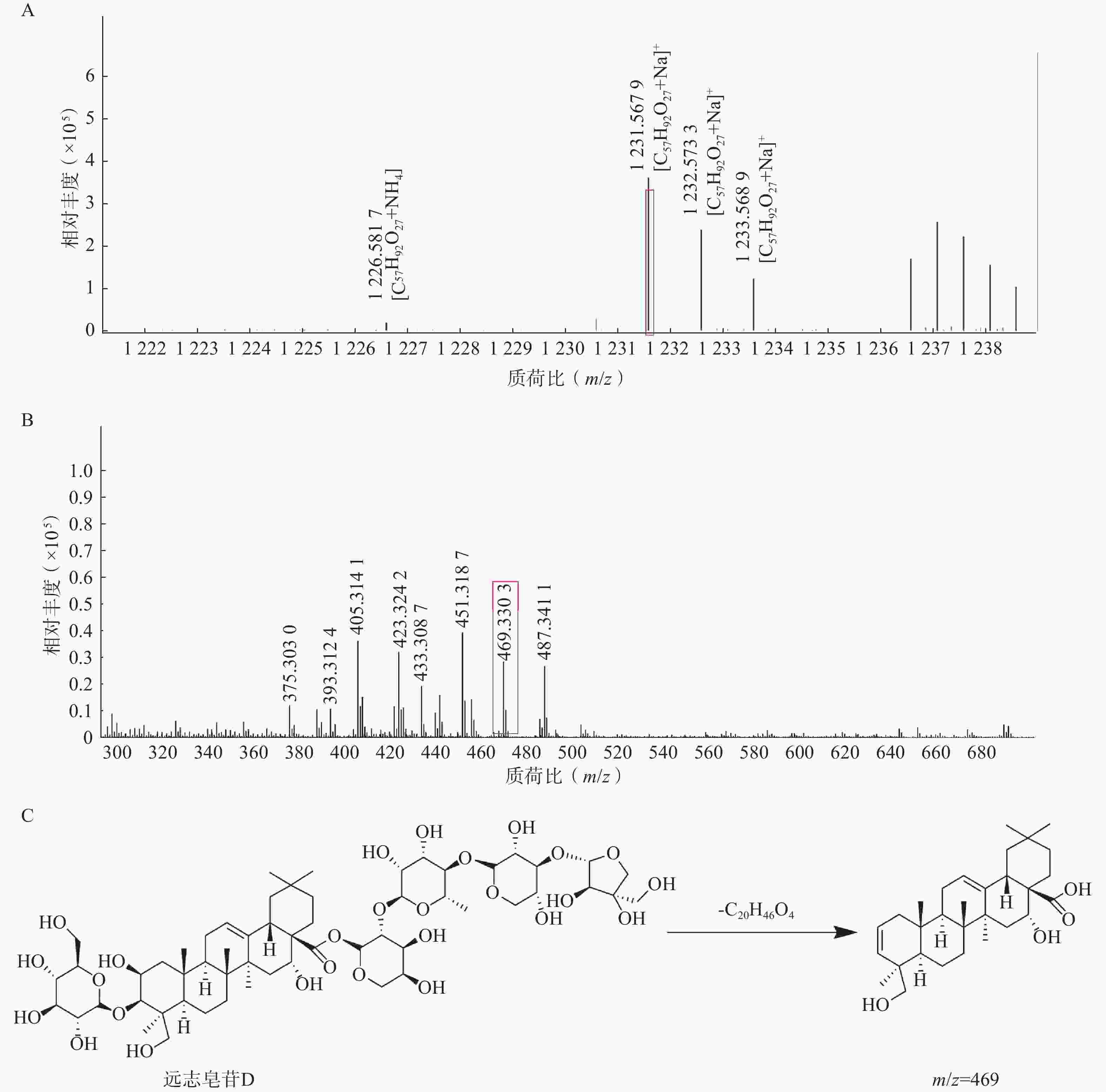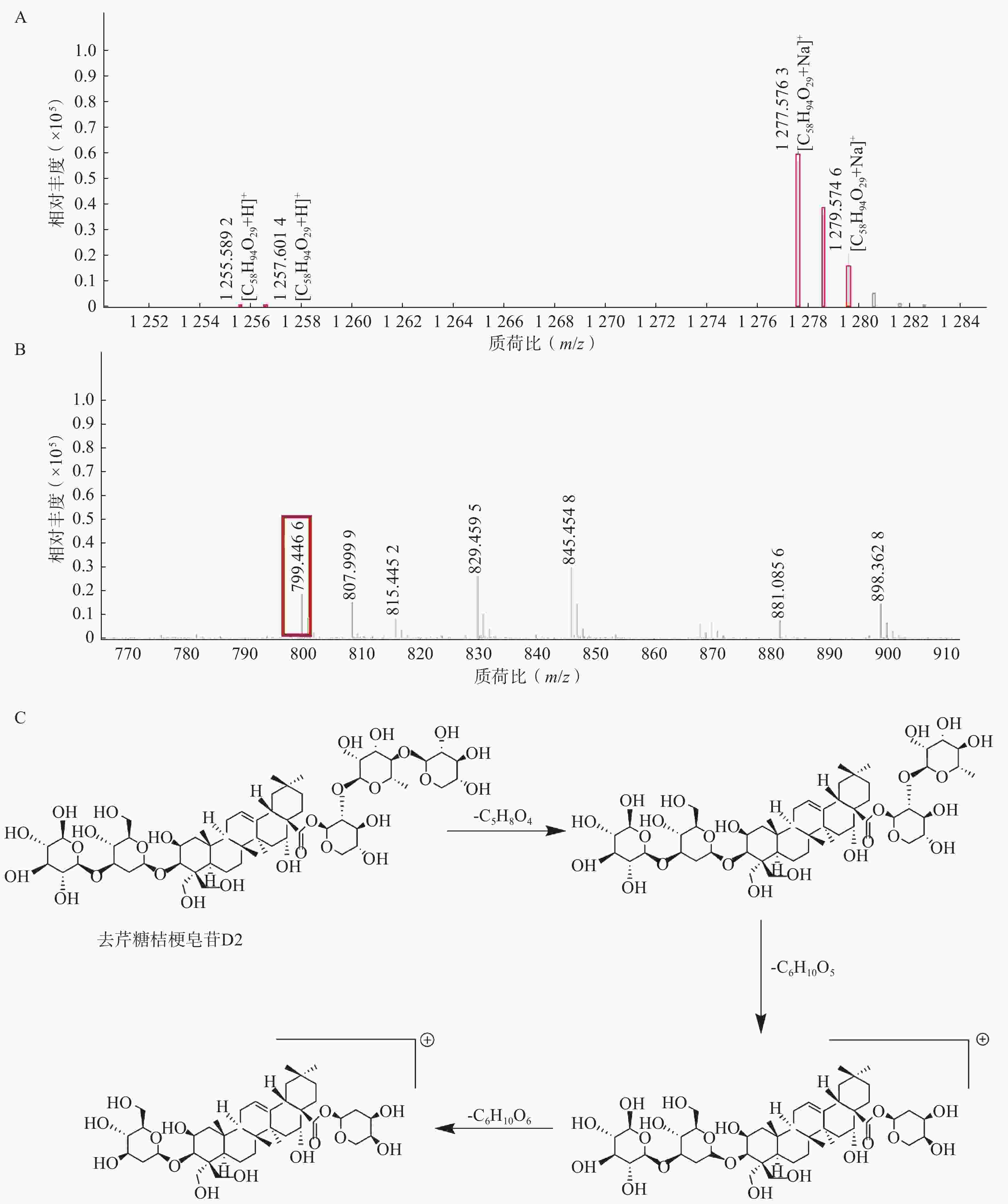 1277.5774 [M+Na]+与 m/z1293.5509 [M+K]+(见图3A)。在二级质谱信息中,该化合物通过逐级断裂糖苷键丢失糖分子,产生特征碎片离子799.684 [M+H-C17H28O14]+。将其与去芹糖桔梗皂苷D2对照品(保留时间11.493 min)比对,二者保留时间差值<0.15 min,且二级碎片离子(图3B)完全一致,故推测化合物6为桔梗皂苷型成分去芹糖桔梗皂苷D2(裂解途径图3C),二级碎片由该化合物C-3位和C-28位糖苷键断裂产生。桔梗皂苷型成分的裂解途径具有共性,例如桔梗皂苷 E 二级质谱信息中可观察到特征碎片 m/z1439.317 [M+Na-C5H8O4]+,桔梗皂苷B2二级质谱信息中可观察到特征碎片 m/z 659.721[M+Na-C6H10O5]+,均为该类型化合物C-3、C-28位糖苷键断裂后产生的典型碎片。远志皂苷型成分以远志皂苷D为例,化合物21在保留时间13.033 min处被检出,一级质谱信息呈现分子离子峰 m/z
