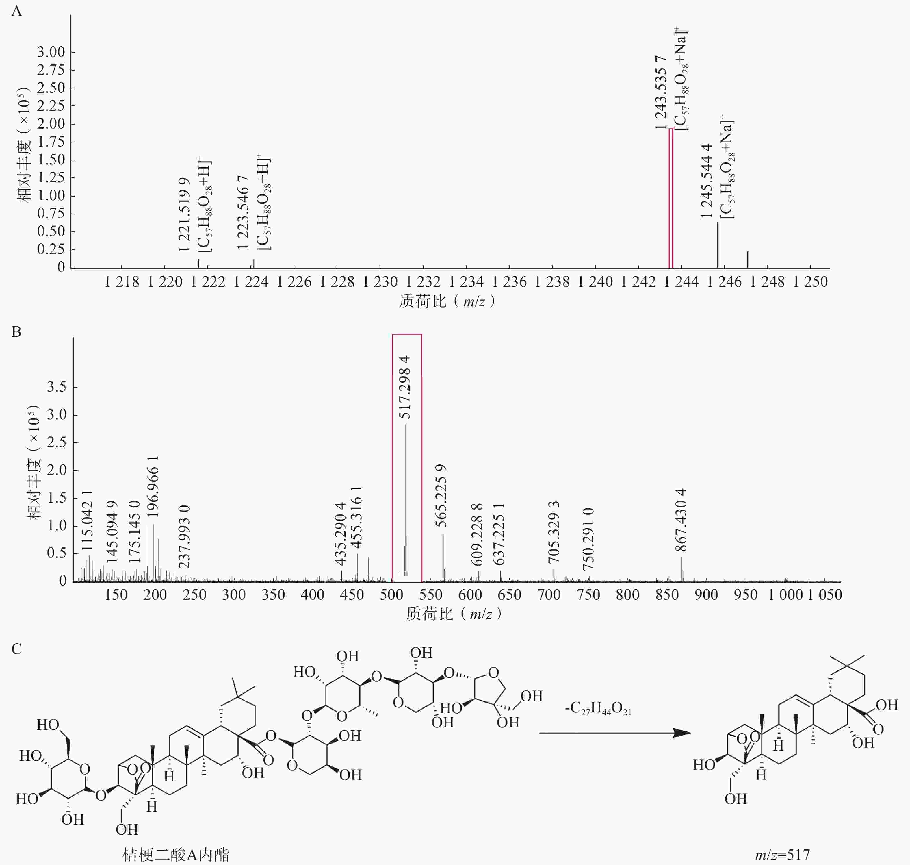 1243.5356 [M+Na]+见(图5A),二级质谱信息可见m/z 517.482[M+H-C27H44O21]+(图5B),为该化合物优先断裂C-3位糖苷键,产生C-28位含有内酯环的碎片离子;推测该化合物为桔梗皂苷内酯型成分—桔梗二酸A内酯(化合物质谱信息及裂解途径见图5C);桔梗内酯型成分的裂解途径具有共性,例如桔梗皂苷M-1的二级质谱信息中可观察到特征碎片m/z 517.377[M+H-C6H10O5]+,均为该类型化合物C-3位糖苷键断裂后的典型碎片离子。 -