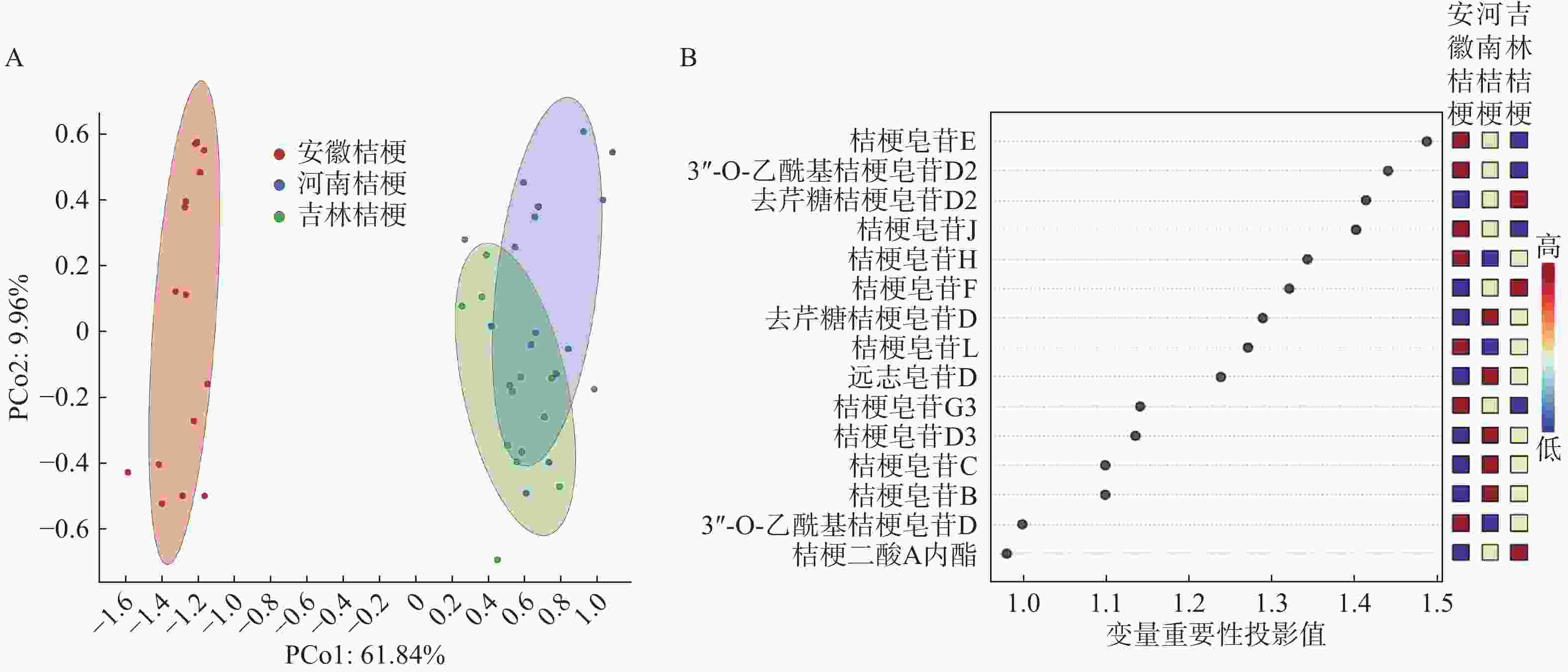 桔梗(Platycodon grandiflorus)为桔梗科多年生的草本植物,具有宣肺,利咽,祛痰,排脓的功效。作为传统药食同源中药,被广泛应用于各种方剂、中成药和保健品中,是我国中药大品种之一[14-15]。其药用价值主要源于三萜皂苷类成分,具有抗炎、免疫调节及镇咳祛痰等药理活性[16]。由于我国桔梗资源分布广泛,不同产地的生态环境差异可能导致桔梗皂苷类成分的组成与含量显著不同,进而影响药材质量与临床疗效[17]。本研究基于UHPLC-Q-TOF/MS技术,系统分析了安徽、河南、吉林3个主产区桔梗的皂苷类成分差异,为桔梗优质资源筛选与质量控制提供了科学依据。