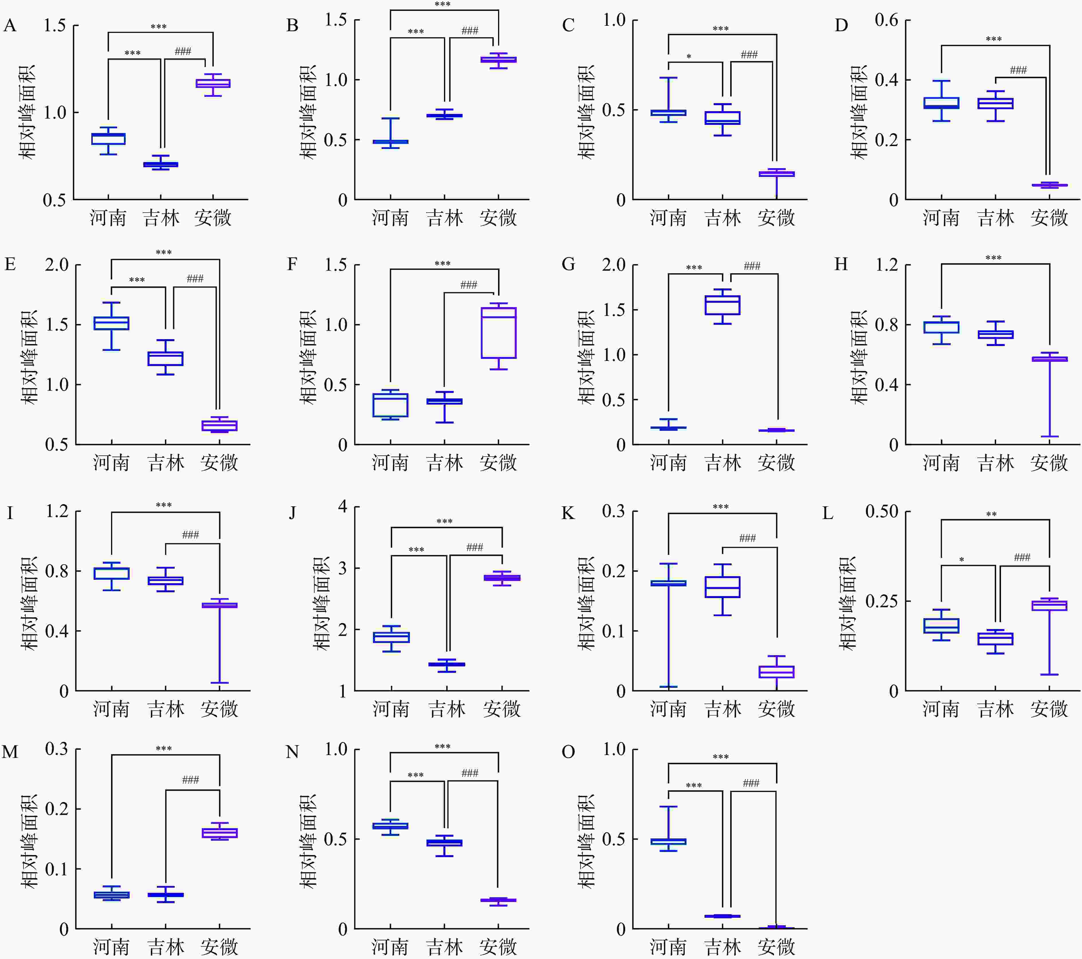 从3个产地的桔梗中鉴定出了15个差异皂苷类成分,以差异成分在各组样品间内标归一化后的峰面积进行相对含量分析。来自3个产地的15种差异性成分的含量变化如图9所示,其中多种成分如3''-O-乙酰远志皂苷D2、桔梗皂苷H、桔梗皂苷L、3''-O-乙酰桔梗皂苷D2、桔梗皂苷G3、桔梗皂苷E在安徽桔梗中的含量高于河南桔梗与吉林桔梗中的含量;桔梗二酸A内酯在吉林桔梗中的含量高于河南桔梗以及安徽桔梗中的含量;桔梗皂苷D3、远志皂苷J、远志皂苷D等在河南桔梗中的含量高于安徽桔梗与吉林桔梗中的含量。以上数据表明不同产地桔梗的皂苷含量具有一定差异,安徽产地桔梗在皂苷类成分的含量上与河南及吉林产地桔梗存在较大差异,且皂苷类成分含量显著高于河南与吉林产地桔梗。