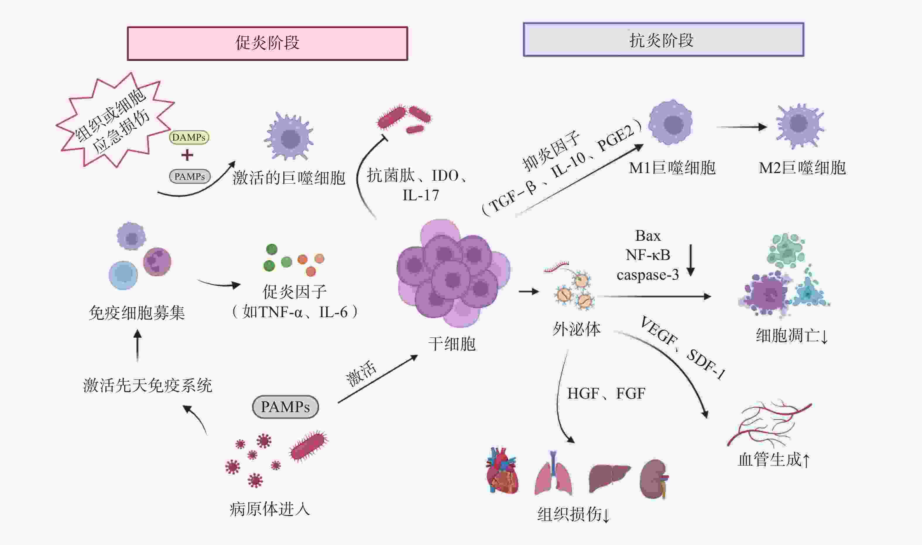干细胞疗法作为再生医学的重要分支,近年来在多种疾病的治疗中展现出巨大潜力,其在脓毒症治疗中的应用同样具有广阔的前景。干细胞凭借其抗菌与抗炎活性,能够直接清除病原体并调节由微生物感染引发的早期炎症反应。同时,干细胞作为有效的免疫调节剂,可以通过抑制过度的炎症或防止免疫抑制,帮助机体恢复免疫稳态。此外,干细胞具有归巢与分布能力,可实现对炎症和损伤部位的靶向治疗,有助于发挥全身性治疗效应。在脓毒症后期,宿主常出现免疫抑制,进而导致MODS,此时干细胞的器官保护作用显得尤为重要。综上所述,干细胞在脓毒症的辅助治疗中展现出明确的转化价值与临床潜力[8]。