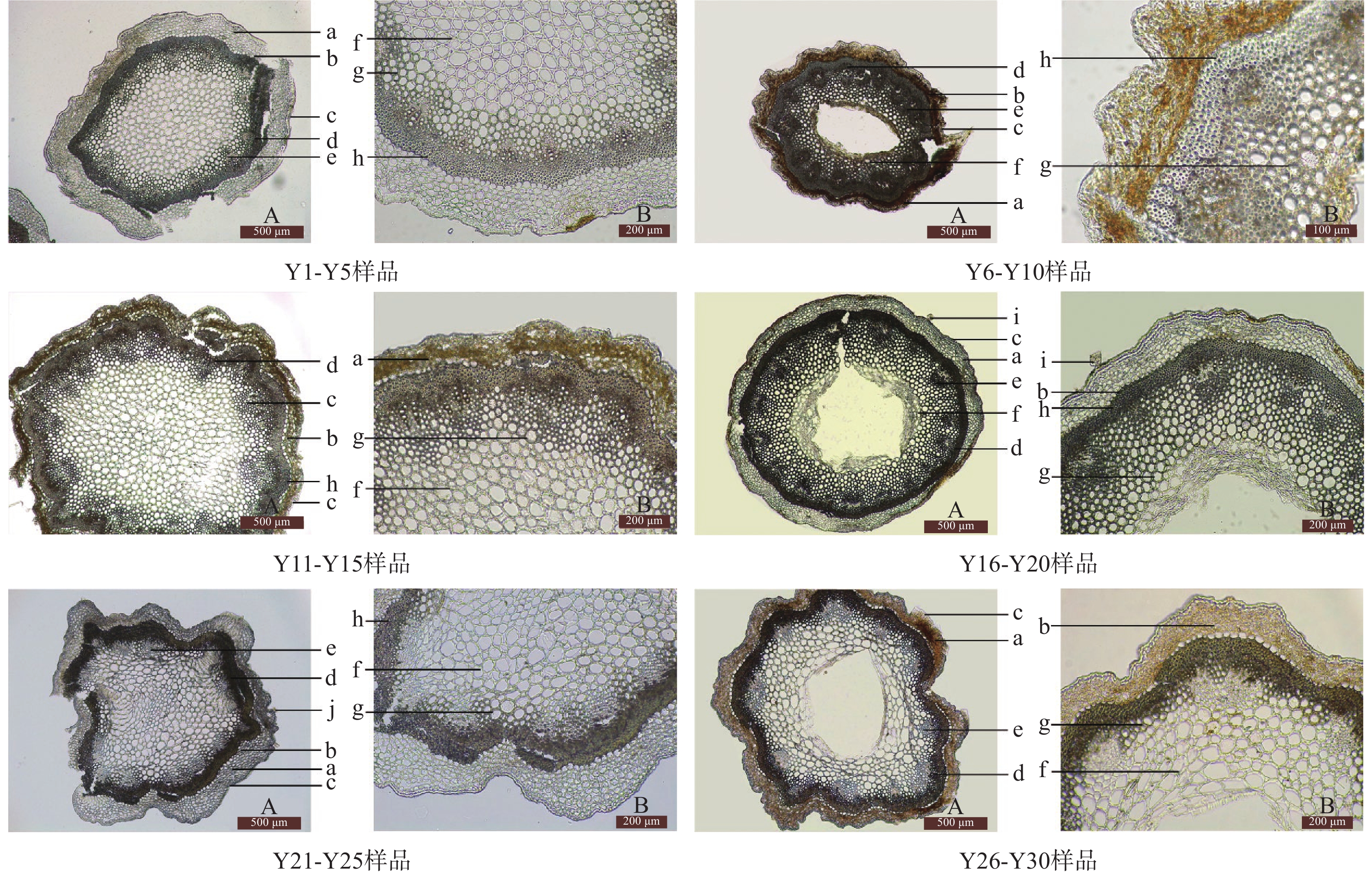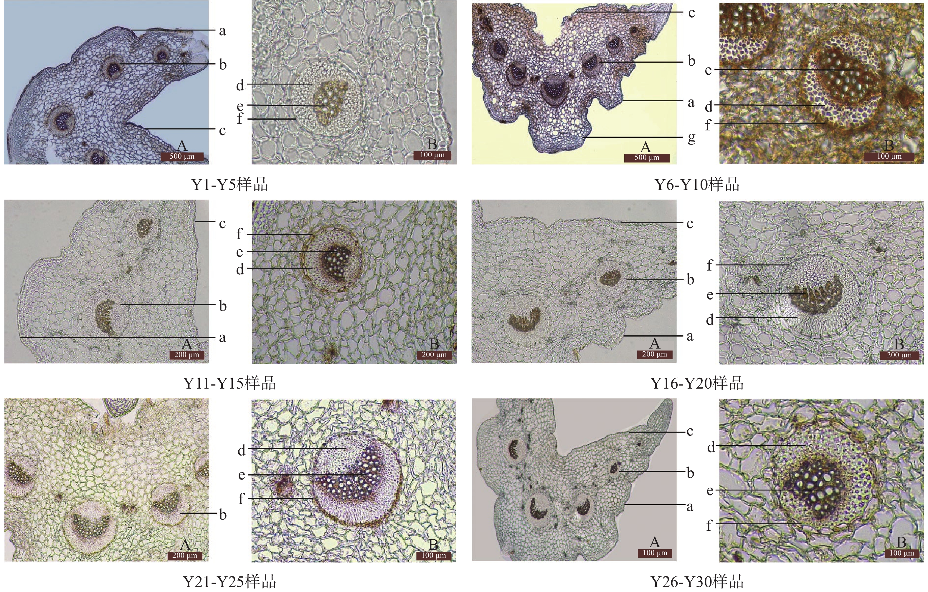 Objective To study the mini-character and microscopic features of Plantago asiatica from different populations and summarize the exclusive features to provide a reference for the effective identification of Plantago asiatica. Methods Stereomicroscope and optical microscope were used to identify 30 batches of Plantago asiatica from different populations.The similarities and differences in mini-character and microscopic features of Plantago asiatica among different populations were identified. Results The differences in mini character between the Plantago asiatica from different populations were mainly reflected in whether there was fluff on the surface of leaves, inflorescence peduncles, and persistent sepals, as well as whether the epidermis of fibrous roots was flaky. The differences in microscopic characteristics between the Plantago asiatica from different populations were mainly reflected in the number of non-glandular hairs on the leaf surface, the shape of the petiole endothelial layer cells, and the number of large vascular bundles, and the number of layers of mesophyll palisade tissue cells, etc. Conclusion Plantago asiatica from different populations can be identified through mini-character and microscopic; by comparing the relevant identification features, which can provide a basis for revising and improving the standards of Plantago asiatica.